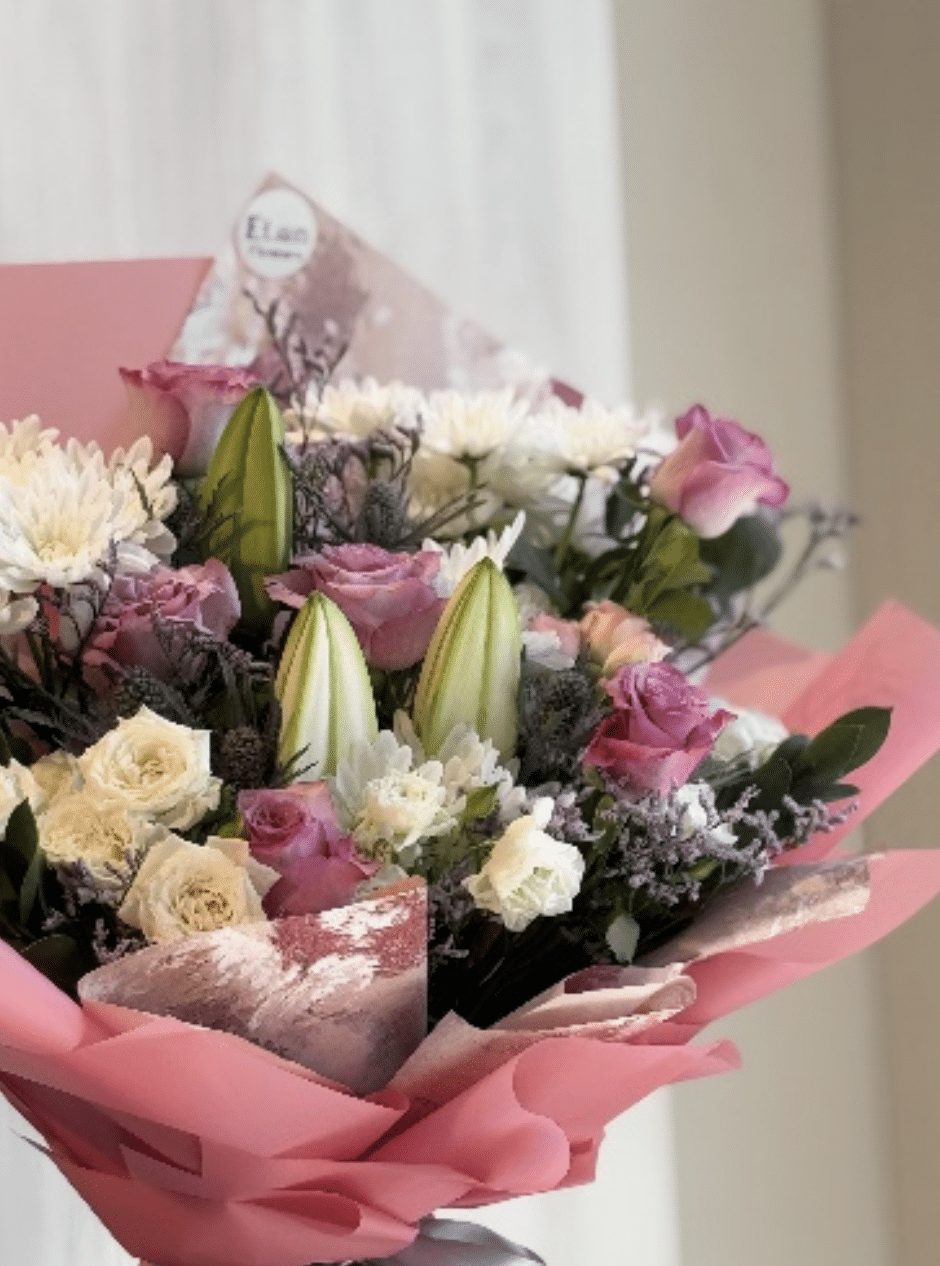 A classic, abundant bouquet featuring large white lily buds, pastel roses, and white chrysanthemums—a harmonious choice for celebrations or heartfelt gifting.