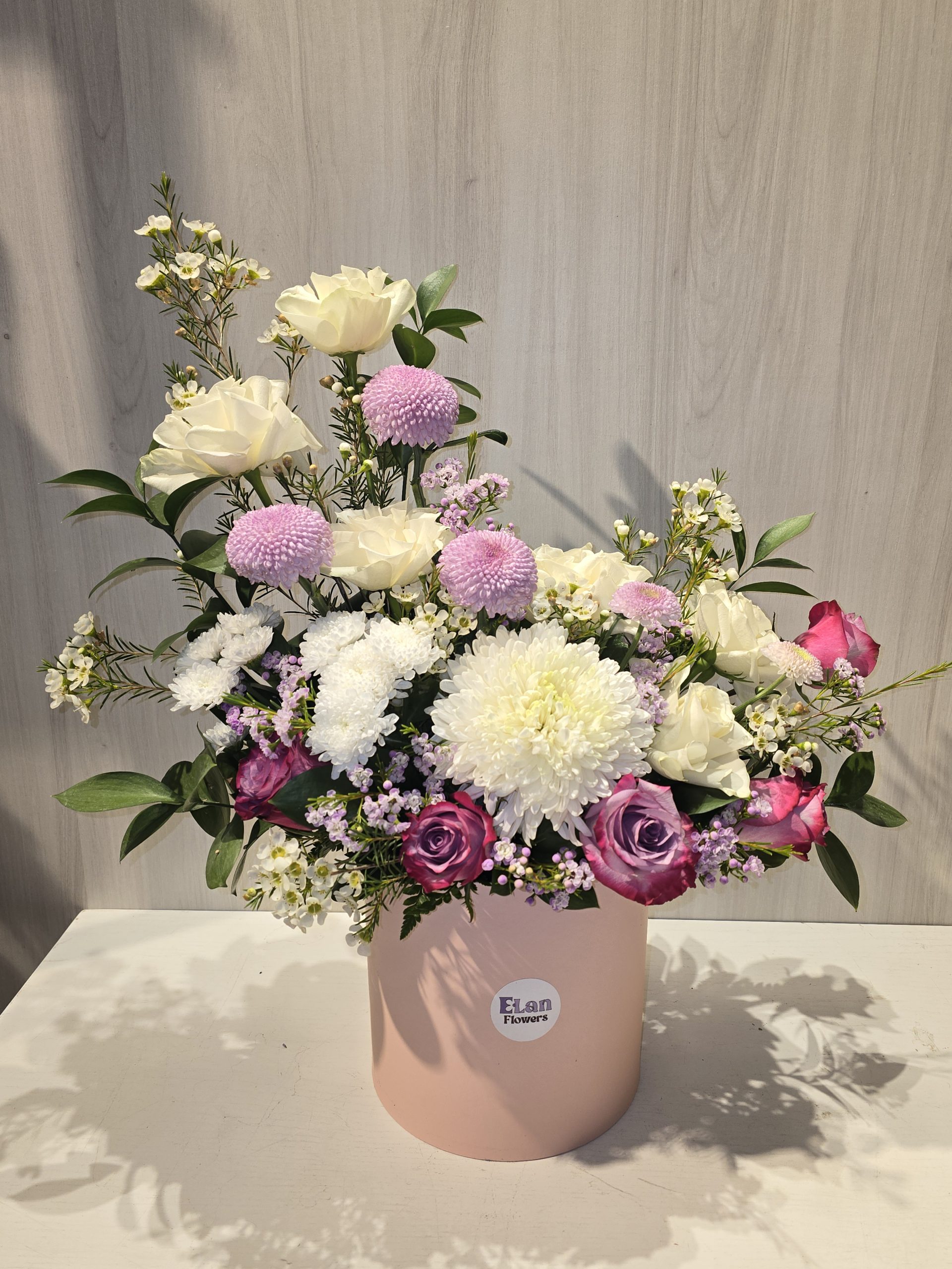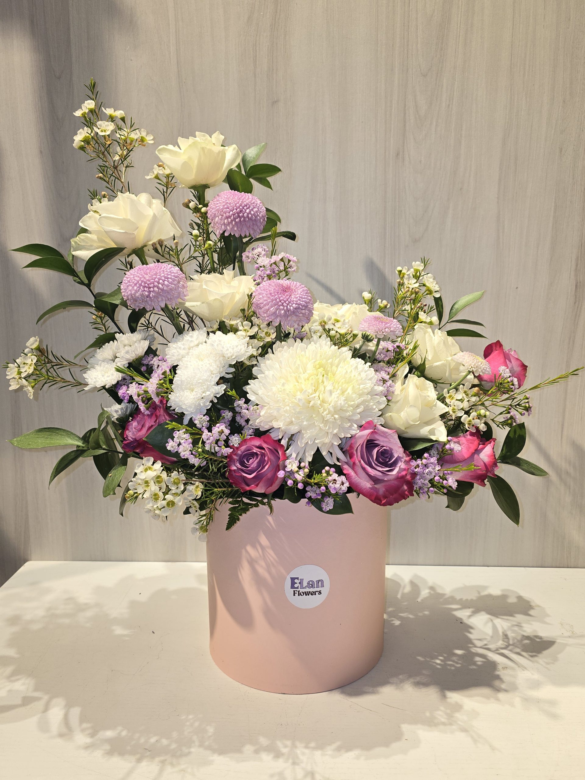بوكس منسق من الجوري الابيض و البنفسجي الغامق مع ورد الديكور الابيض والكرس الابيض والبنفسجي واكسسوار الواكس الابيض وأغصان الرسكوس البيضاء