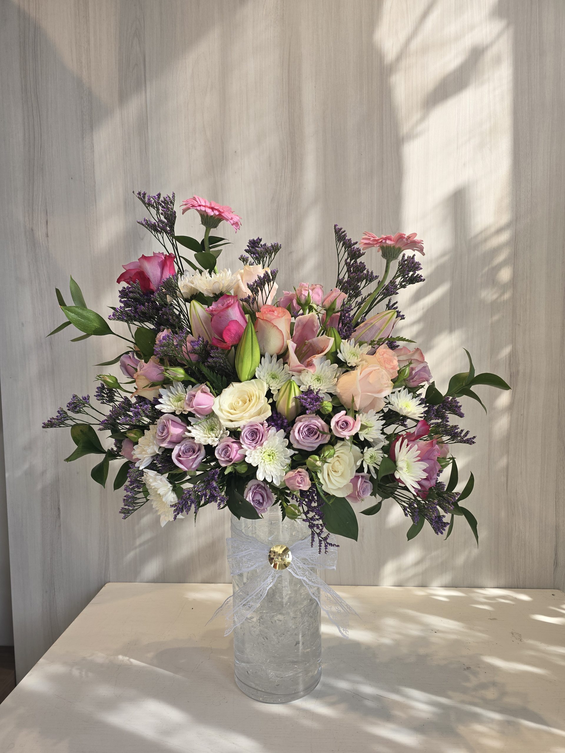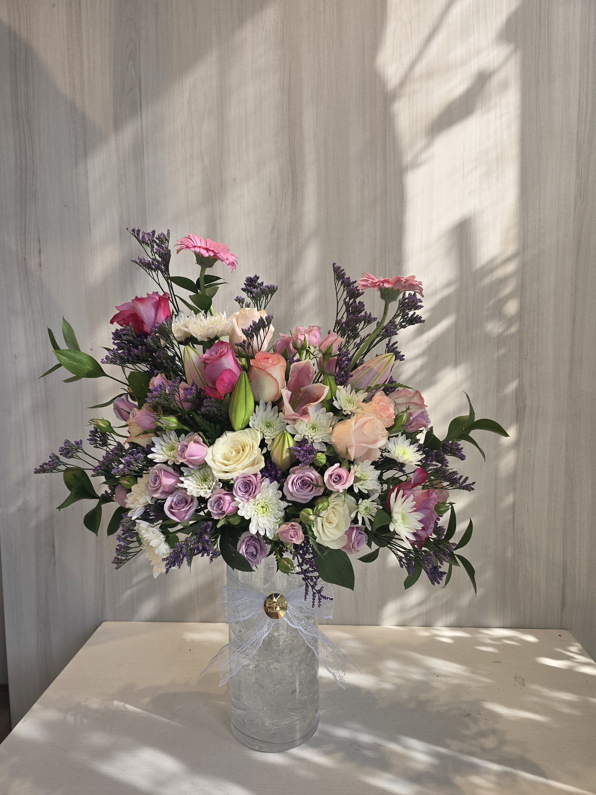 فازة منسقه من ورد الكذابلانكا البنك ومع الحورى البنك دبل كلر والجورى الابيض والبنك والبنفسجي والكرس الابيض وورد الجلبيرا البنك مع اكسسوار المونيا البنفسجي واغصان الرسكوس الخضراء