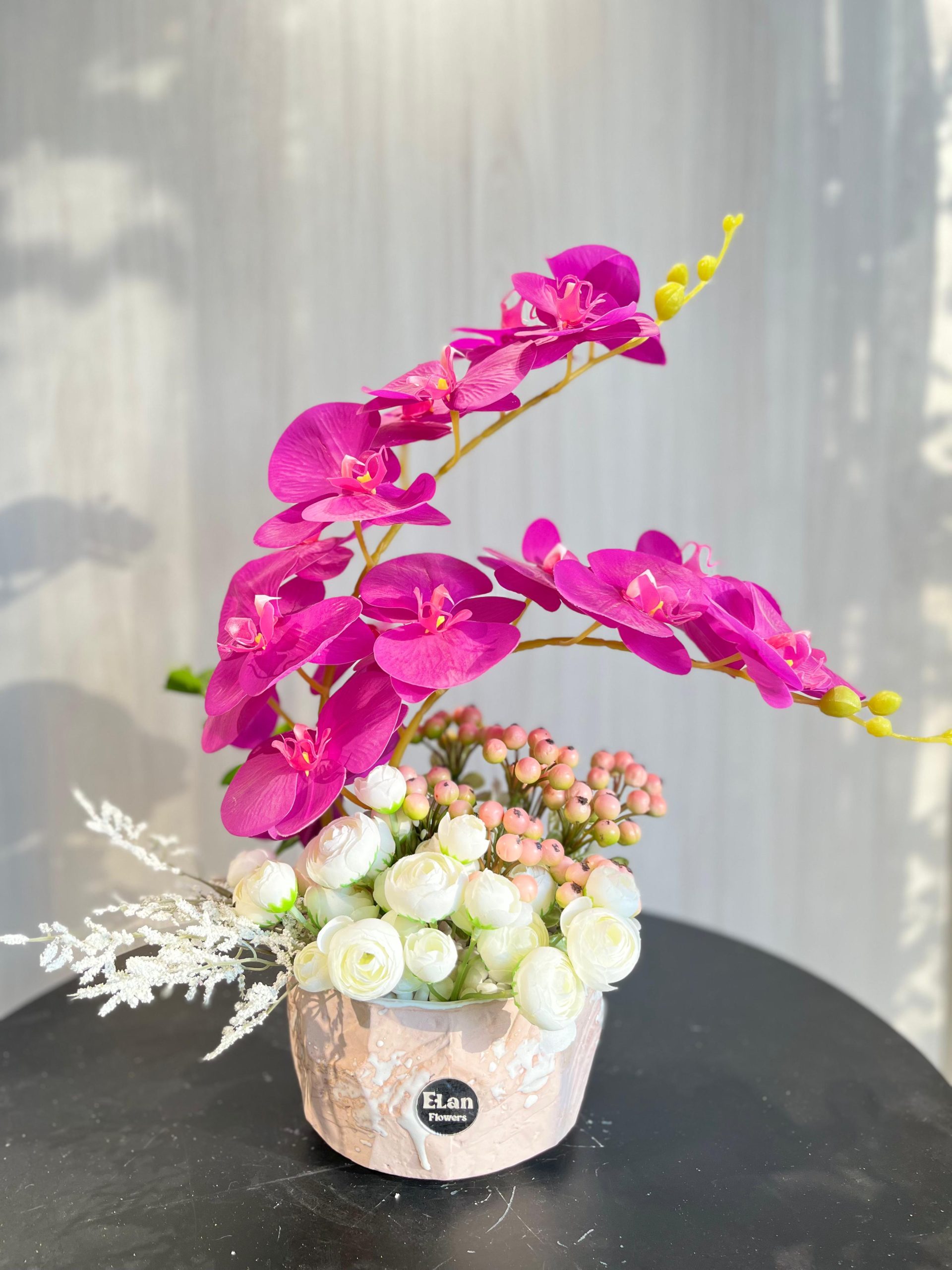 فازه من الفخار منسقه من ورد الاوركيد الفوشي بنك مع البيوني الابيض مع أغصان المونيا البيضاء والهيبركوم