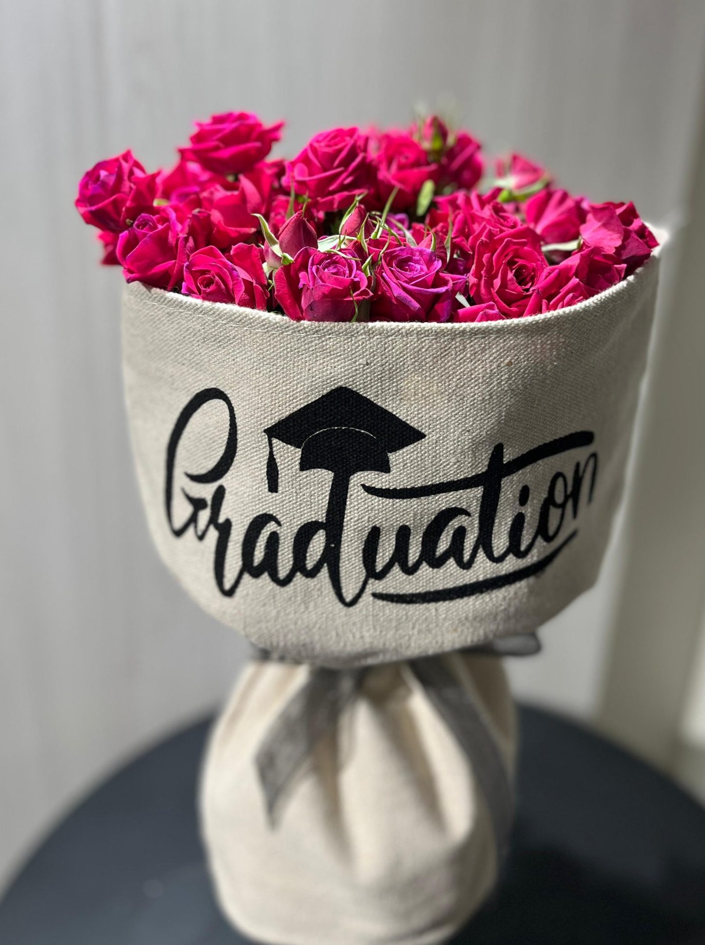 باقة التخرج المنسقه من البيبي روز الفوشي بنك والمغلفه بالقماش البيج الفاتح مع عبارة Graduation