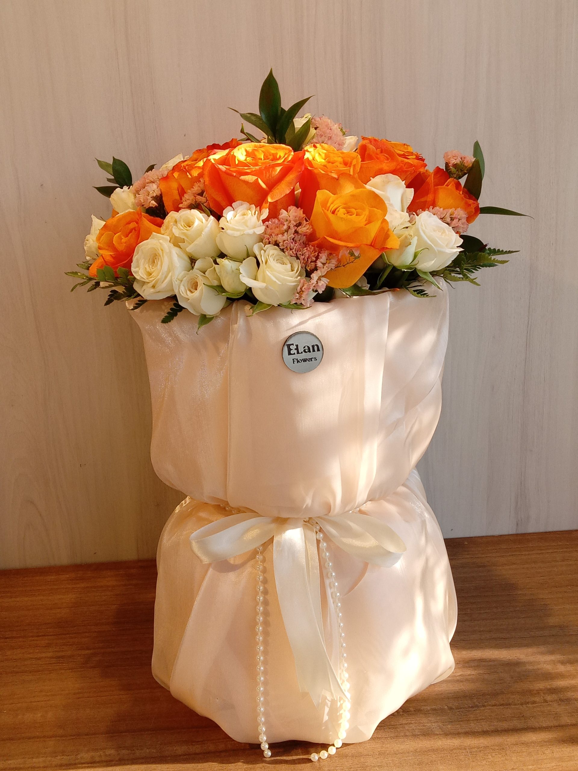 باقة ورد منسقه من الجوري الأورنج مع البيبي روز الابيض والتغليف الاورجانزا الافوايت