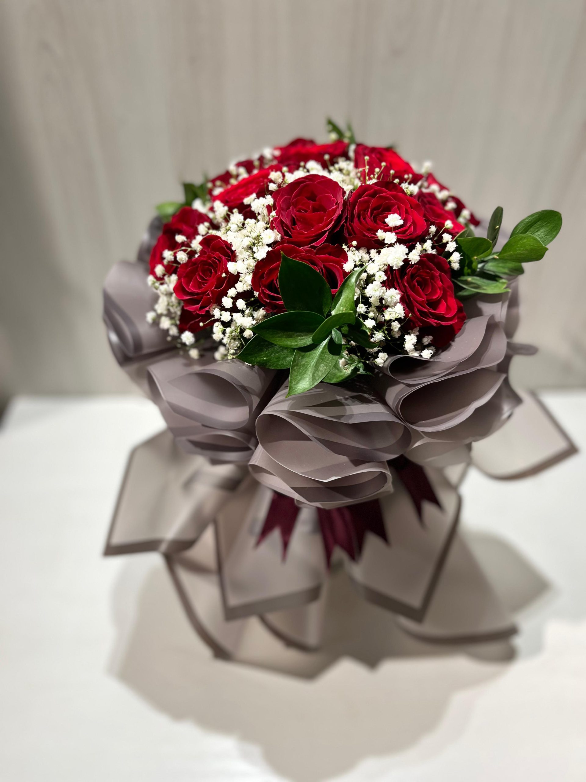 باقة منسقه من الجورى الاحمر مع الجيبسو الابيض وأغصان الرسكوس الاخضر ومغلفه نغليف الاسود الشفاف