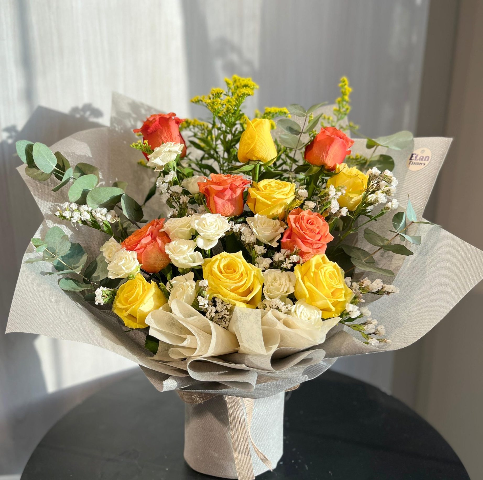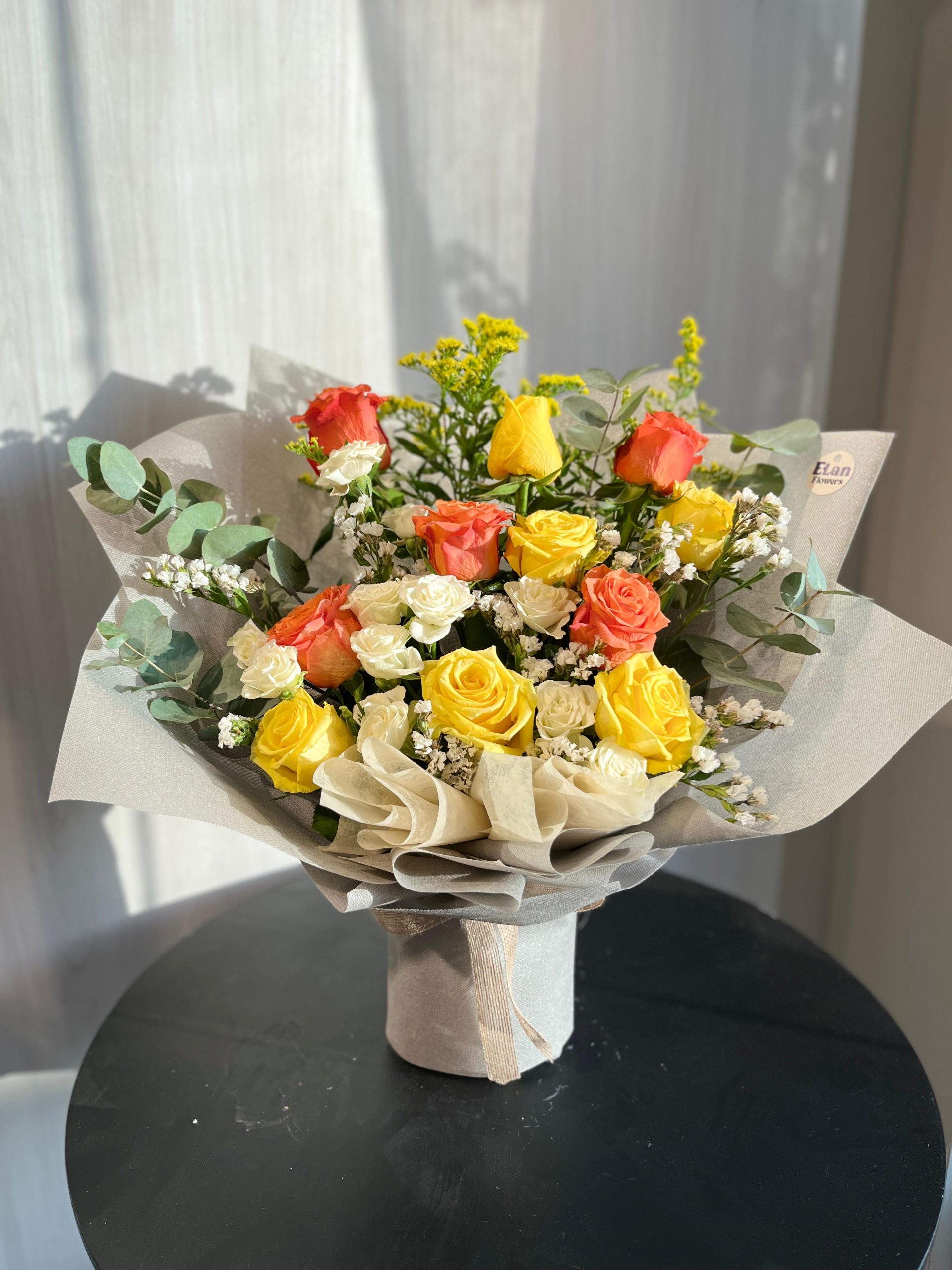 باقة الجوري الاصفر والاورنج مع البيبي روز الابيض وأغصان السلوداجو الصفراء واليكلبتوس الاخضر