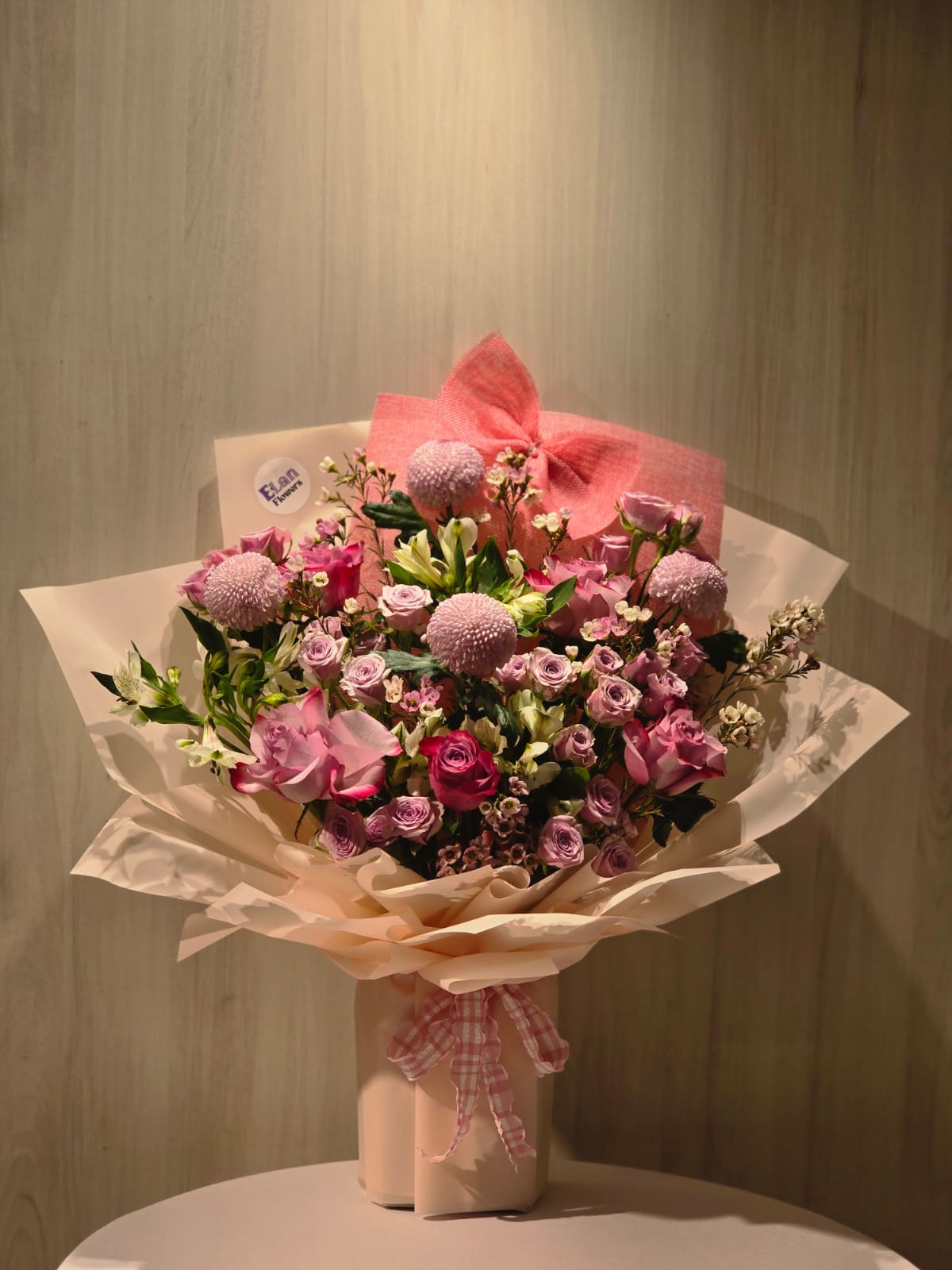 باقه منسقه من الجوري والبيبي البنفسجي مع الكرس الهولاندي البنفسجي والاستروماريا البيضاء والغلاف المكس بنك فاتح مع غامق