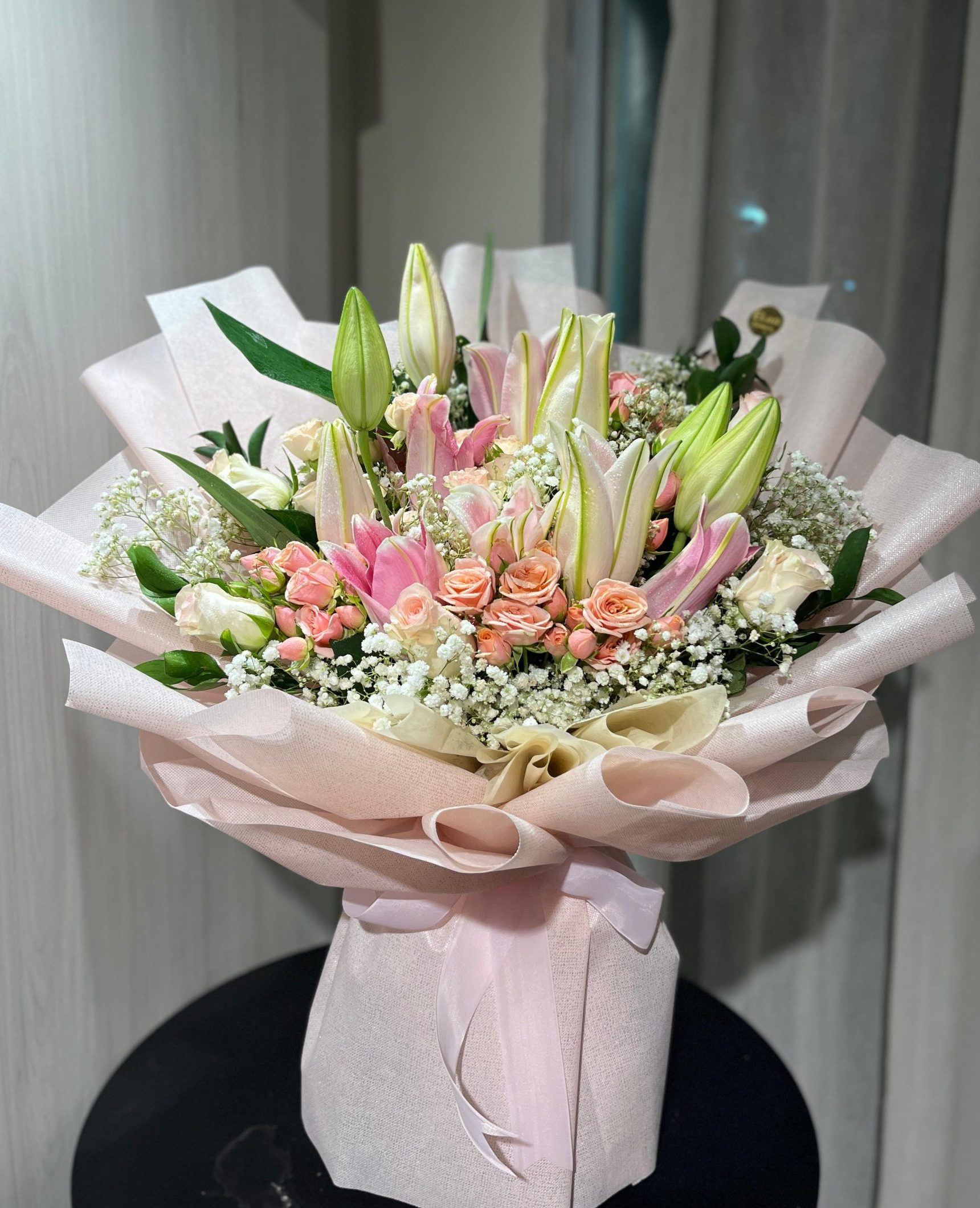 باقة ورد منسقه من الكذابلانكا والبيبي روز الاورنج الفاتح والبيبي روز الابيض مع الجيبسو واغصان الرسكوس