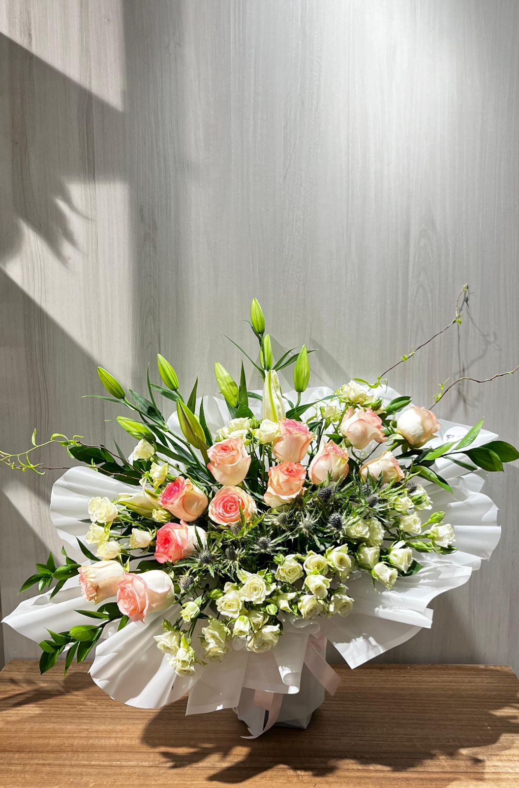 باقة منسقه من الجورى البنك دبل كلر مع الكذابلانكا البيضاء والبيبي روز الابيض والسرنجوم الأزرق مع أغصان الرسكوس الخضراء