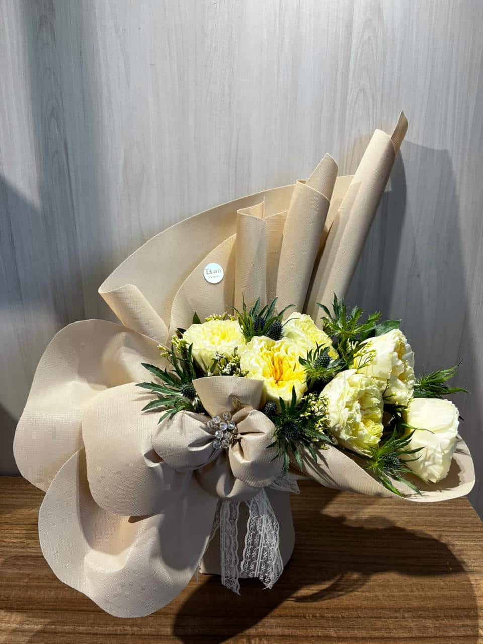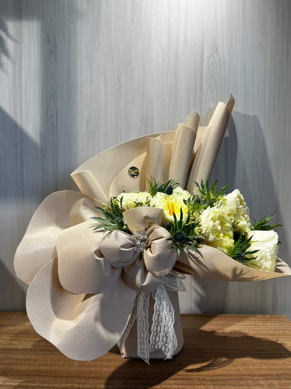 باقة منسقه من ورد الاوهاره الافوايت مع اكسسوار السرنجوم الأزرق والمونيا الاصفر