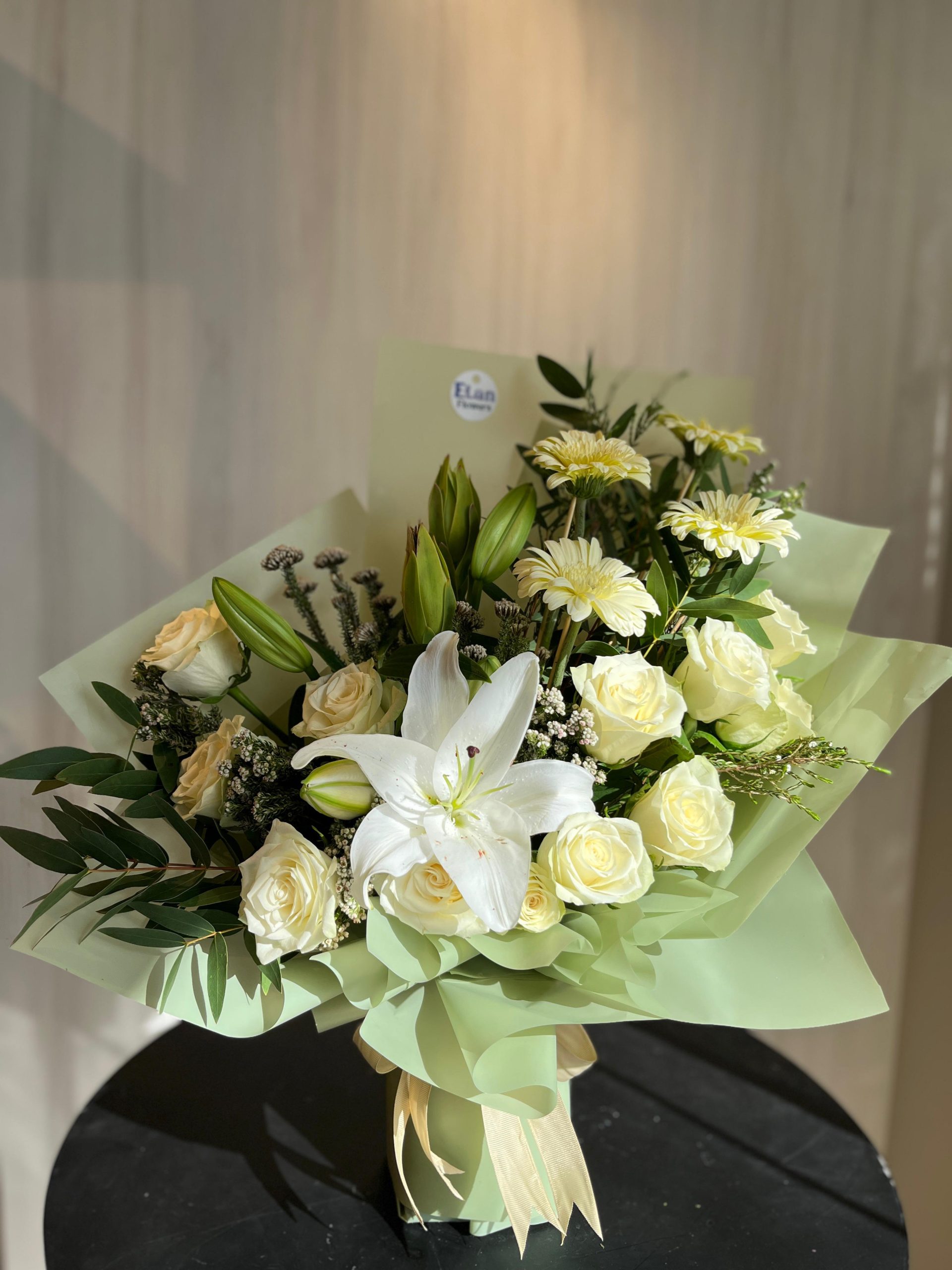 باقة الورد المكونه من الجوري الابيض والكذابلانكا البيضاء وورد الجلبيرا واغصان الرسكوس الخضراء