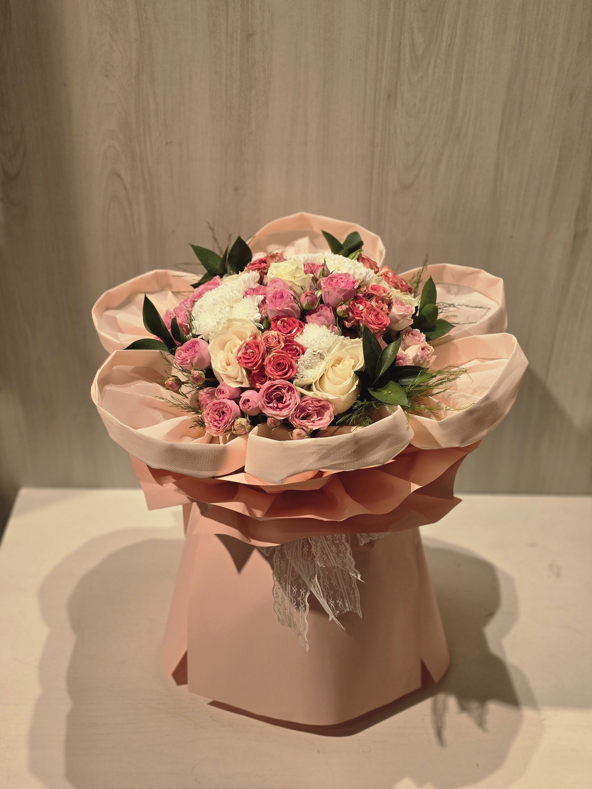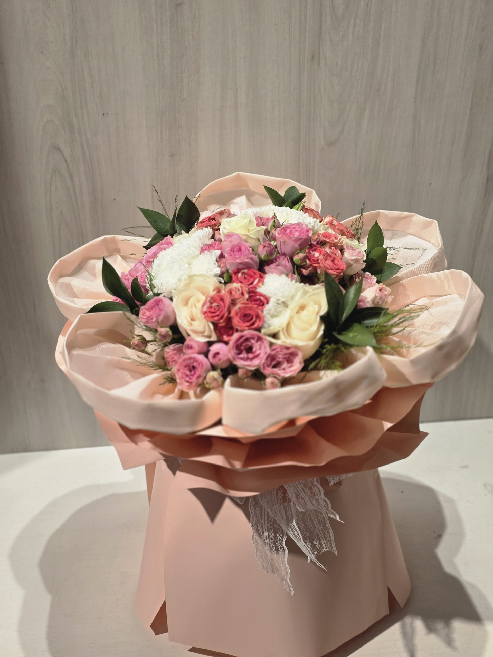 باقة منسقه من ورد البيبي روز البنك والجوري الابيض والكرس الابيض مع أغصان الرسكوس الخضراء مغلفه مكس تغليف اللون البنك