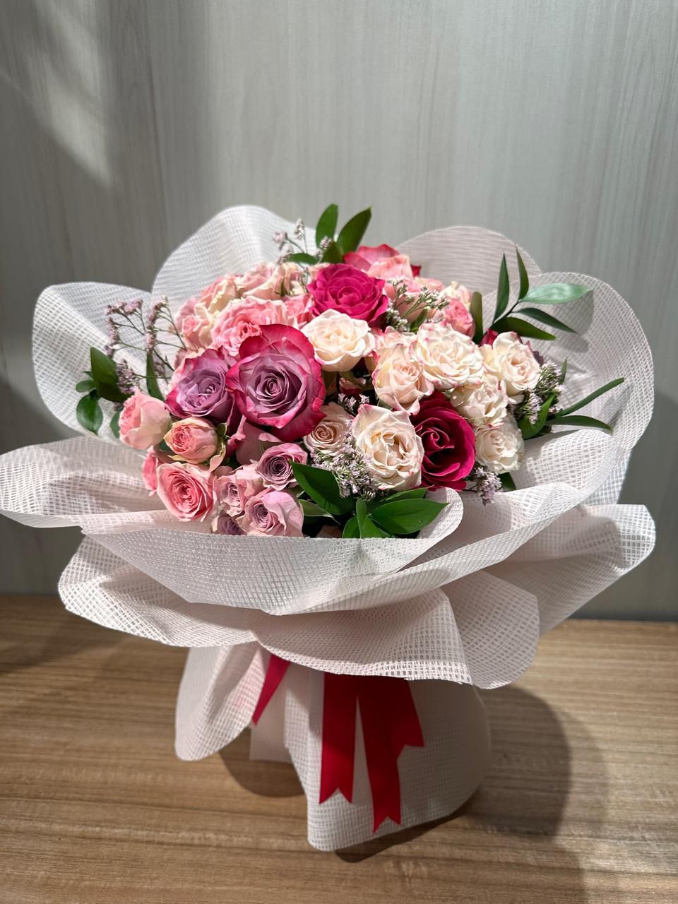 باقة منسقه من البيبي روز البنك دبل كلر مع الجورى الفوشي بنك والجورى البنفسجي الدبل كلر مع اكسسوار الواكس الابيض وأغصان الرسكوس البيضاء