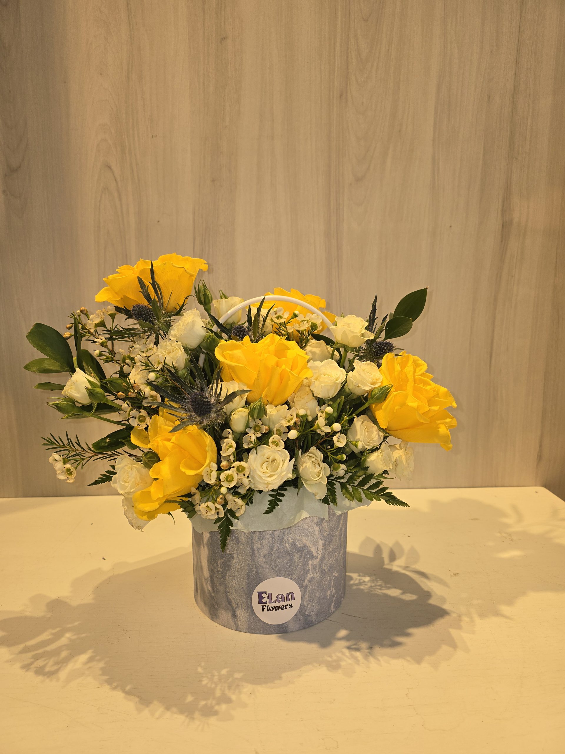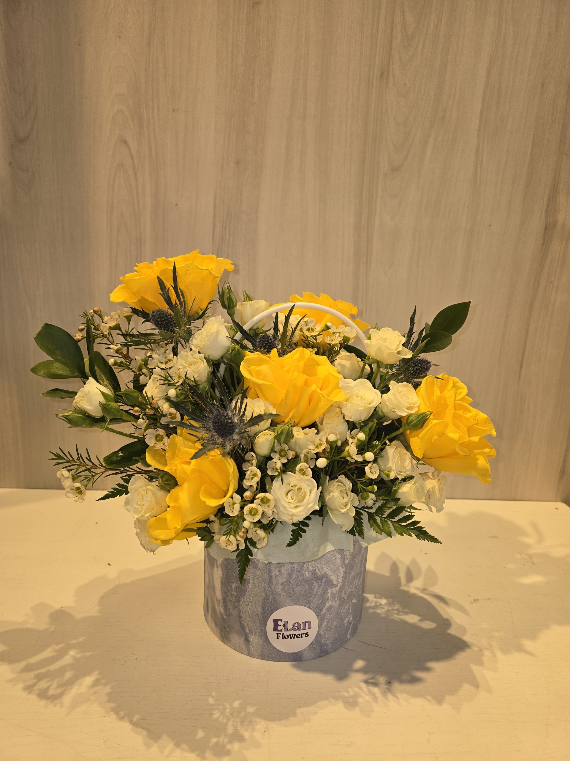 بوكس منسق من ورد الجورى الاصفر والبيبي روز الابيض مع الواكس الابيض واغصان الرسكوس الخضراء