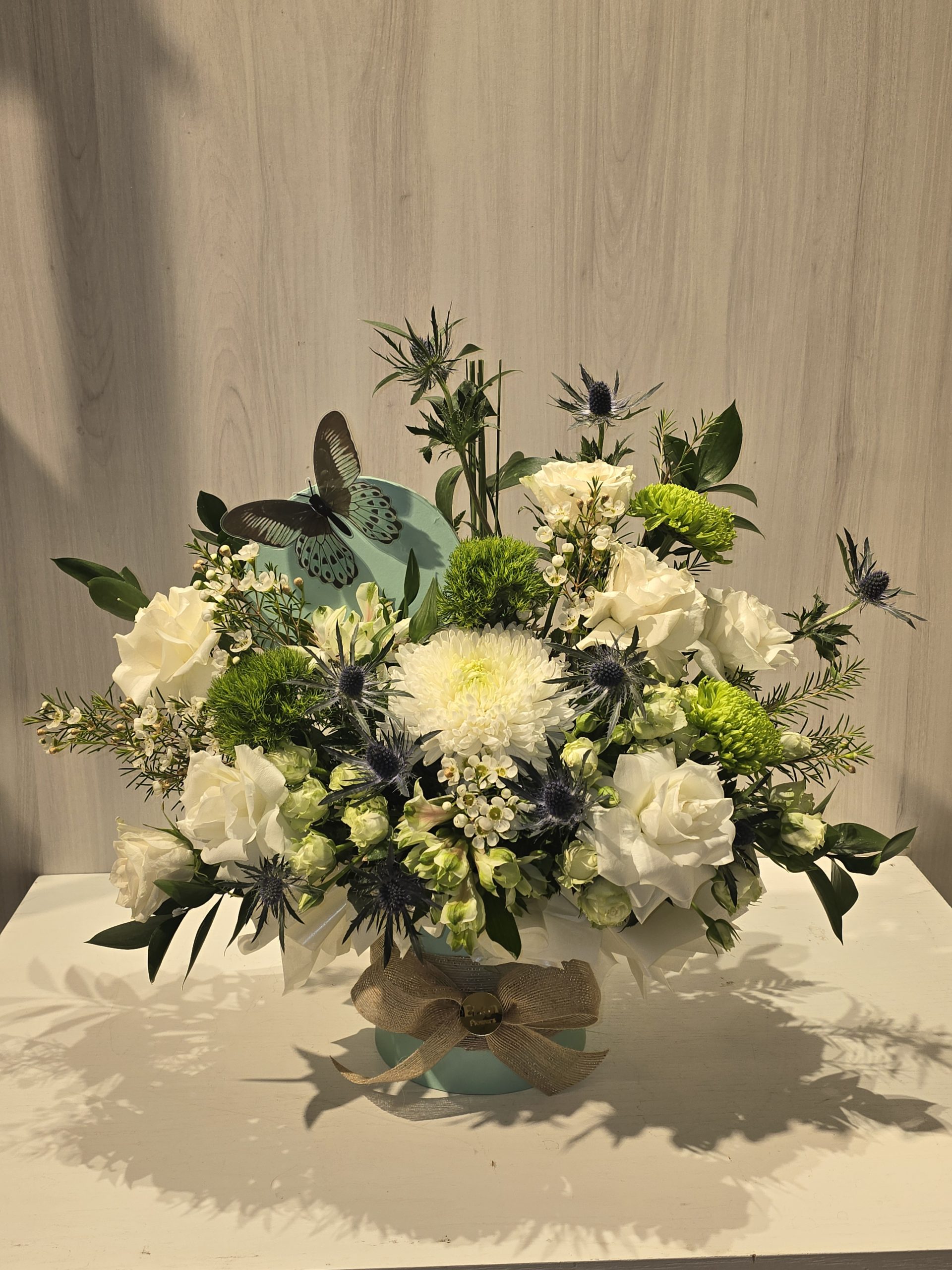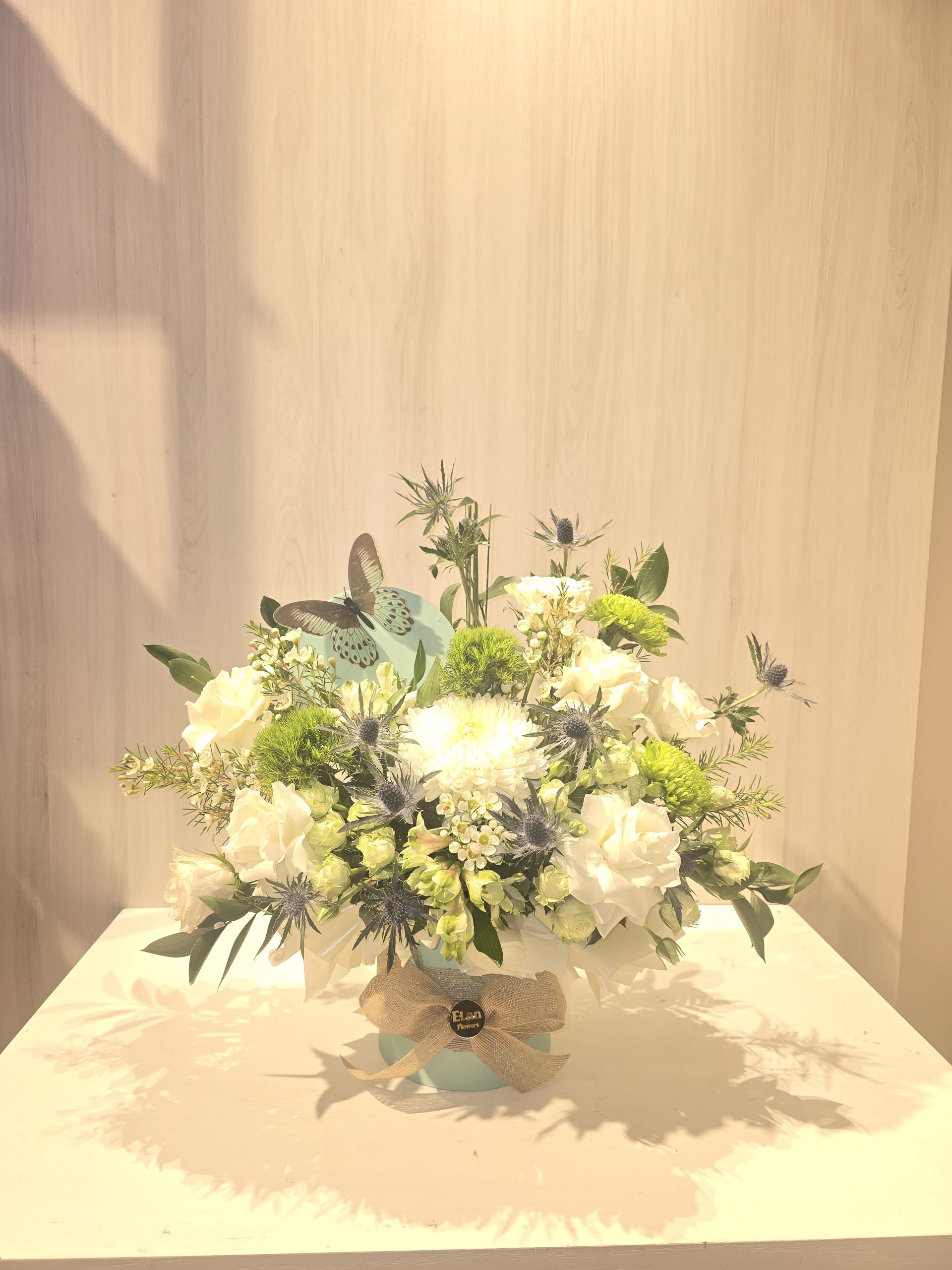 بوكس منسق من ورد الجوري الابيض والديكو الابيض مع الكرس الاخضر واكسسوار الواكس الابيض