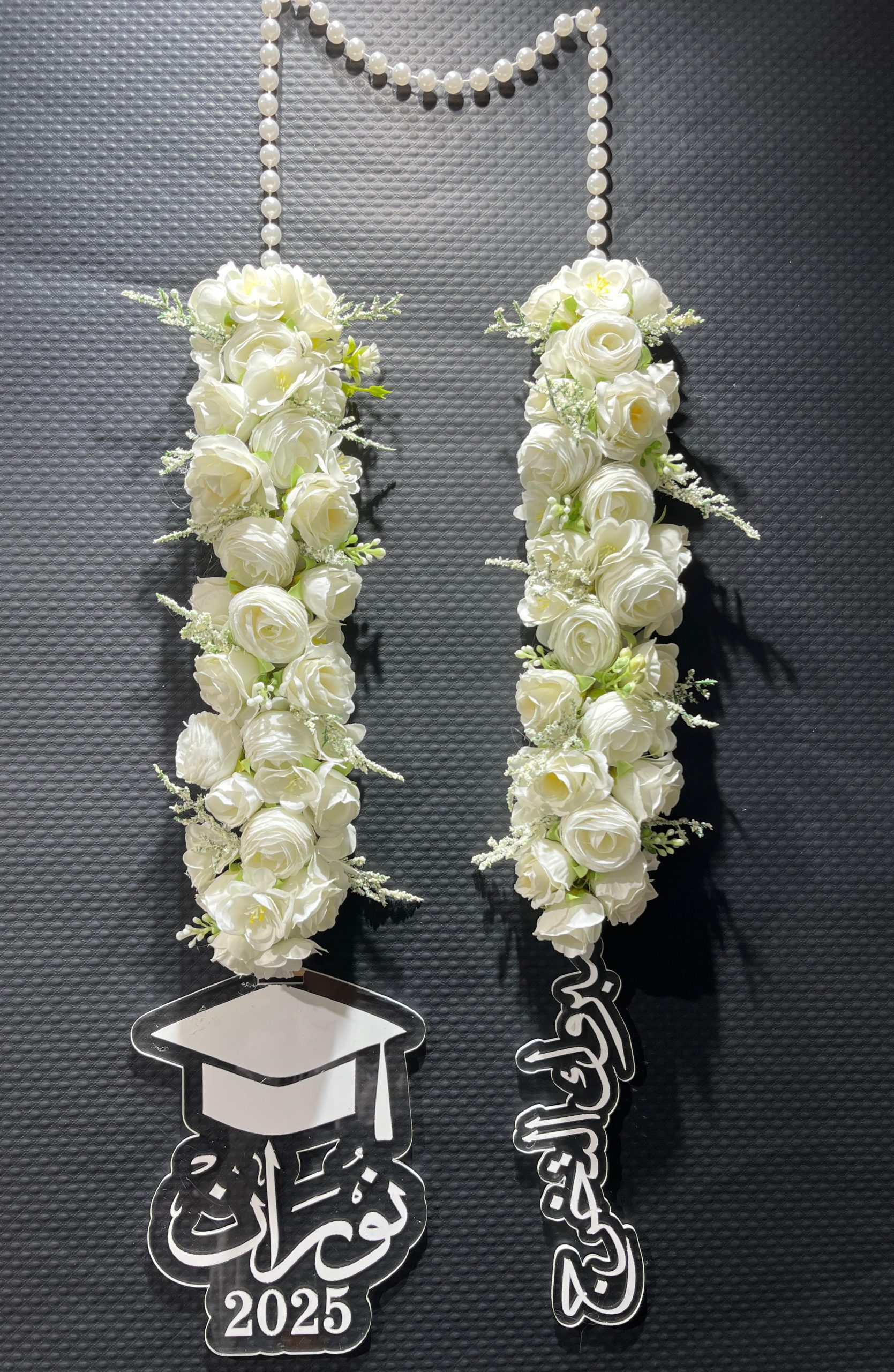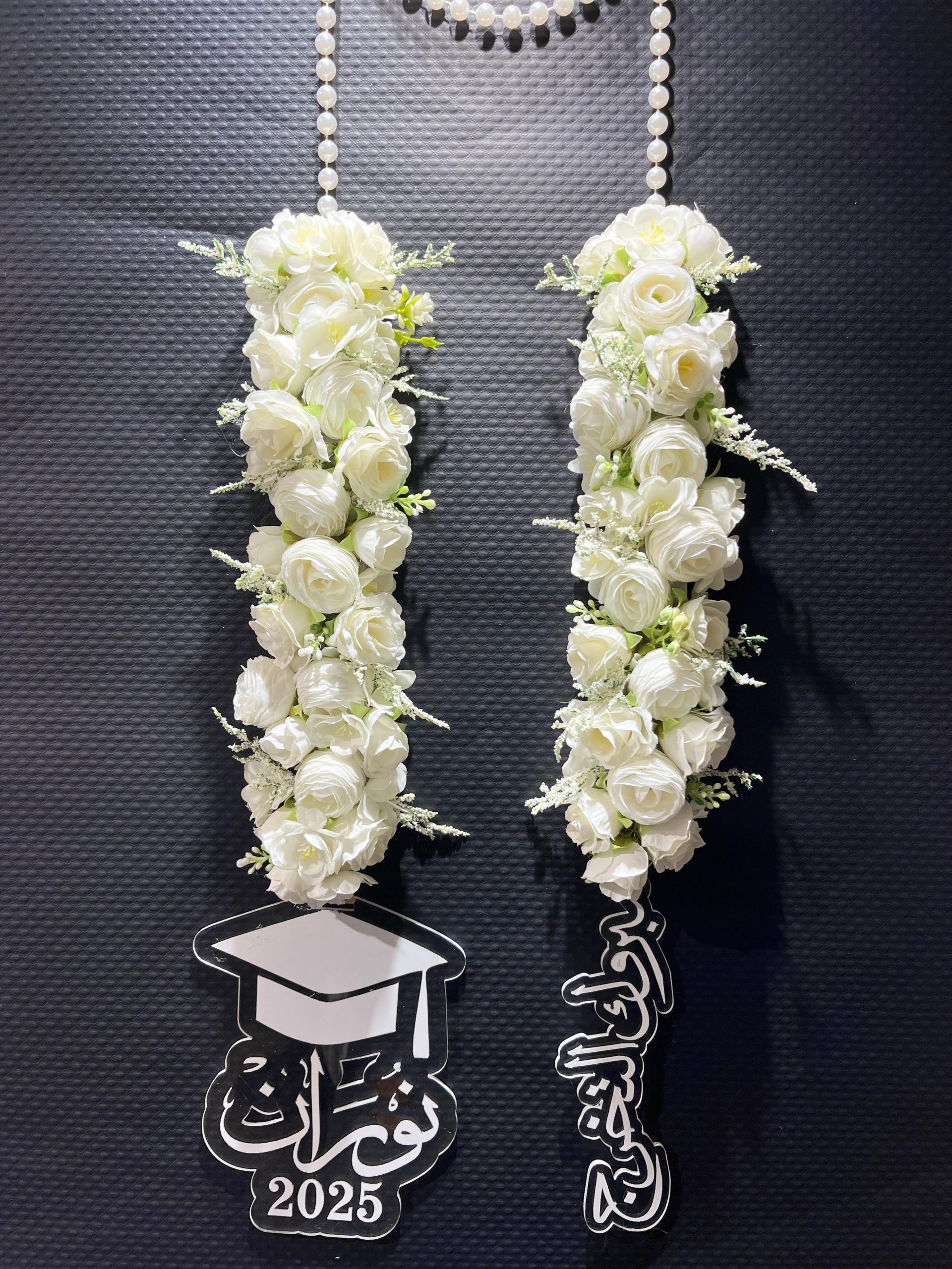 عقد ورد صناعي مكونه من البيبي روز الابيض مع أغصان المونيا الابيض والاكليرك الطلب الاسم والسنه
