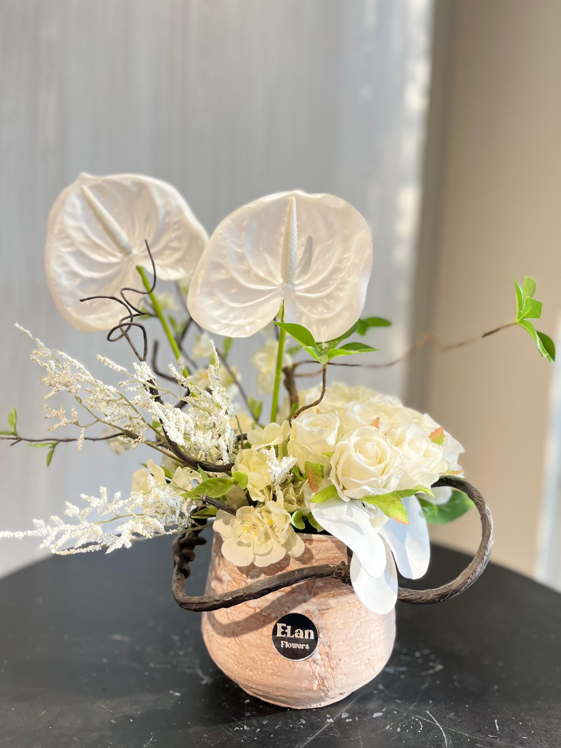 فازه منسقه من ورد الانثوريوم الابيض مع الجوري الابيض الصغير واللمونيا البيضاء والاغصان البنيه