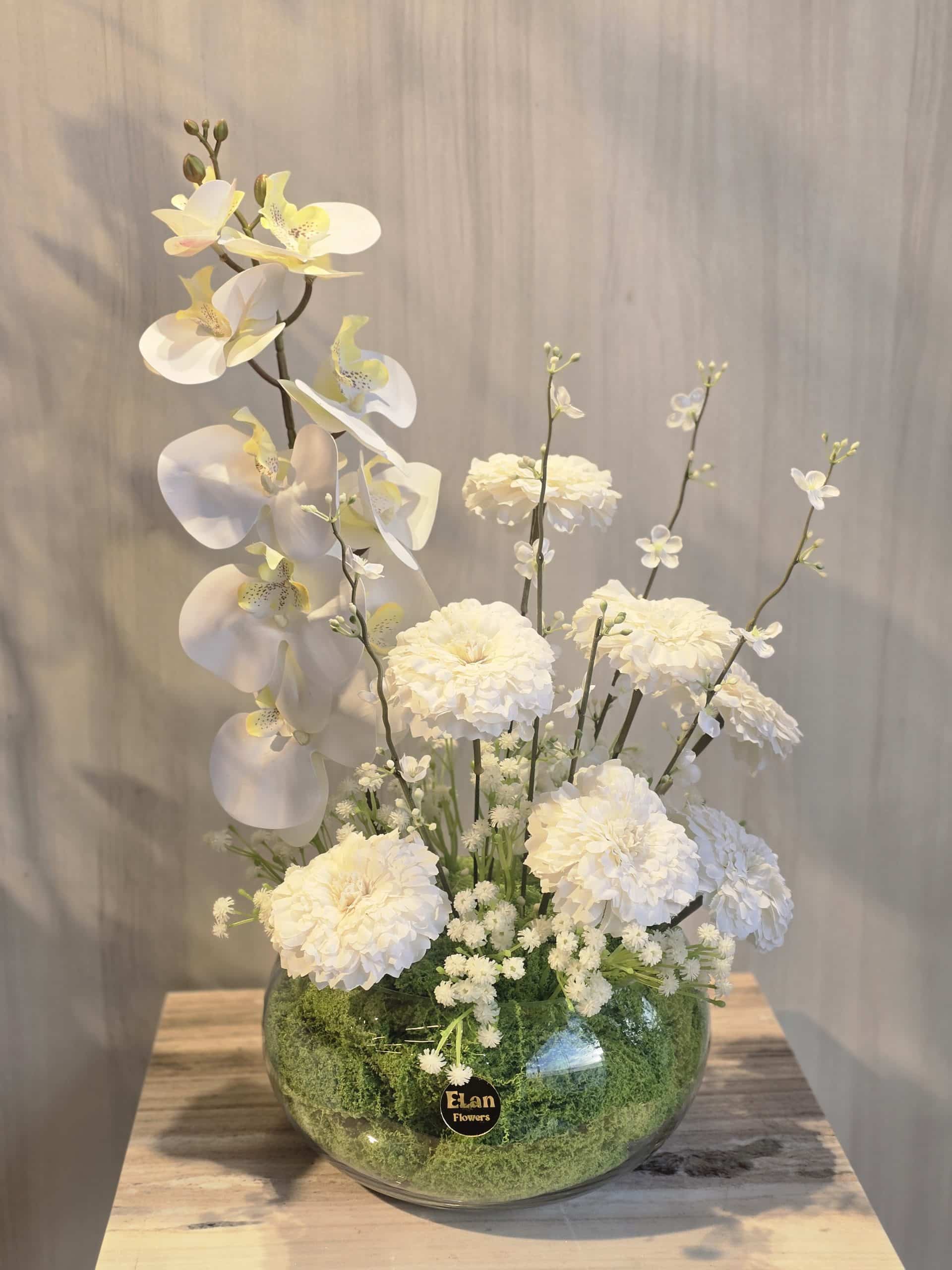 فازة منسقه من ورد الاوركيد الابيض مع ورد الرنانكلوس