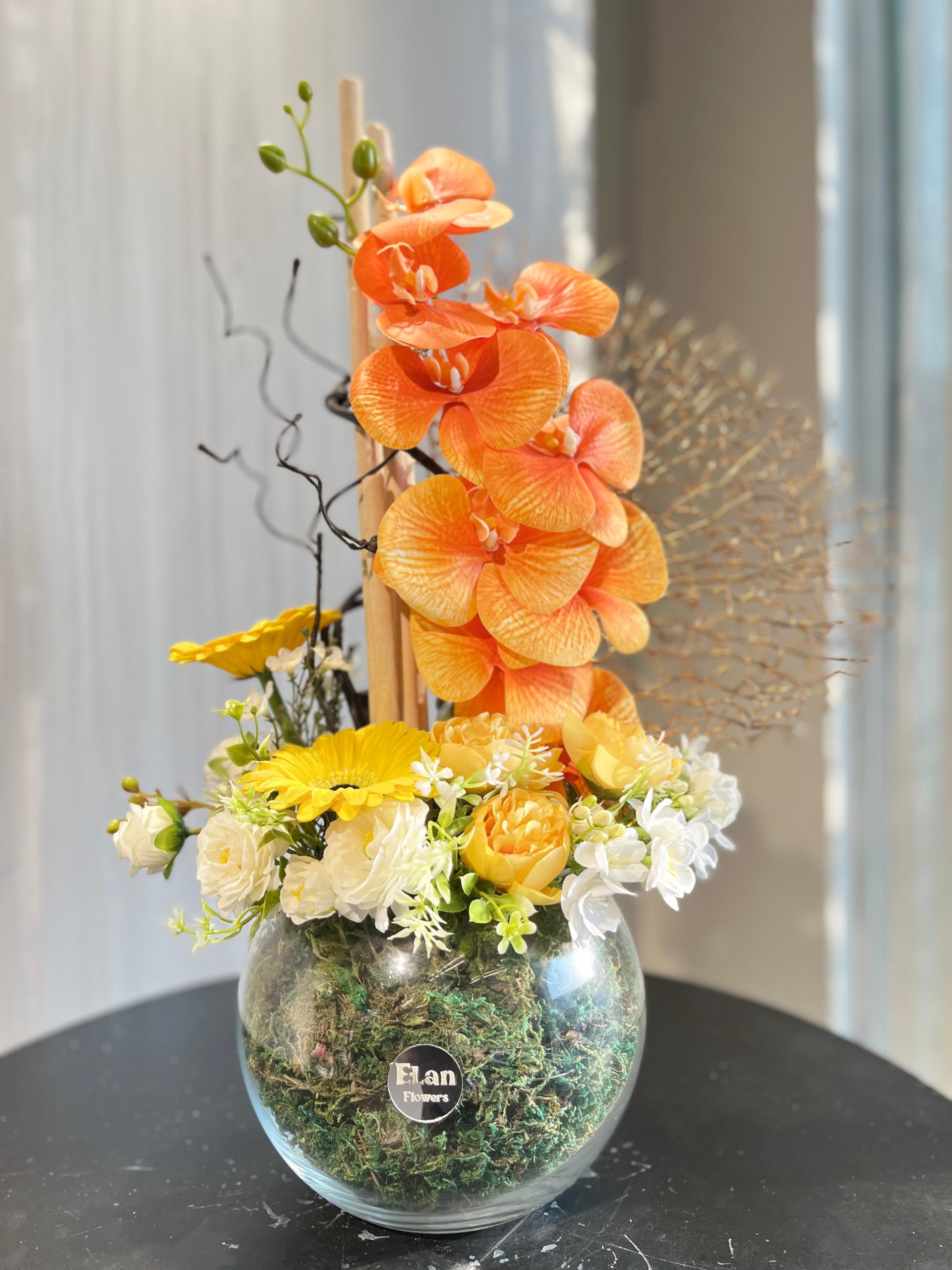 فازة منسقه من الاوركيد الاورنج مع البيبي روز الاصفر والابيض والجلبيرا الاصفر