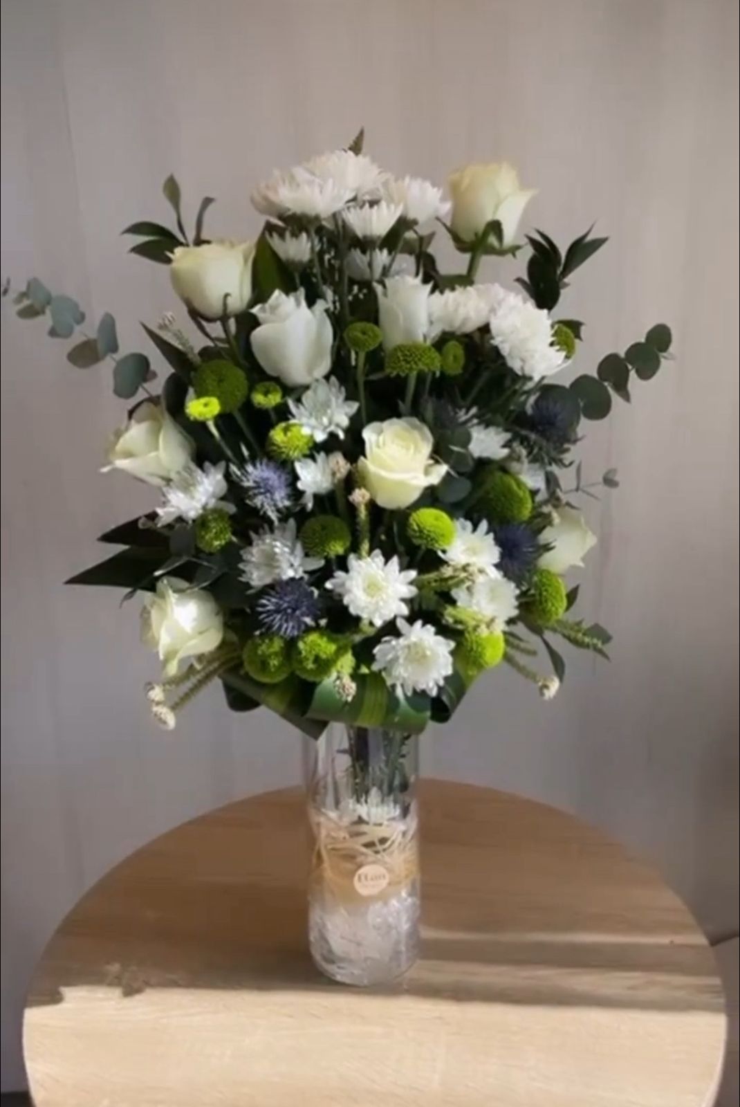 فازة منسقة من ورد الكرس الابيض مع الاخضر والسرنجوم الأزرق مع الجوري الابيض و أغصان اليكالبتوس الاخضر
