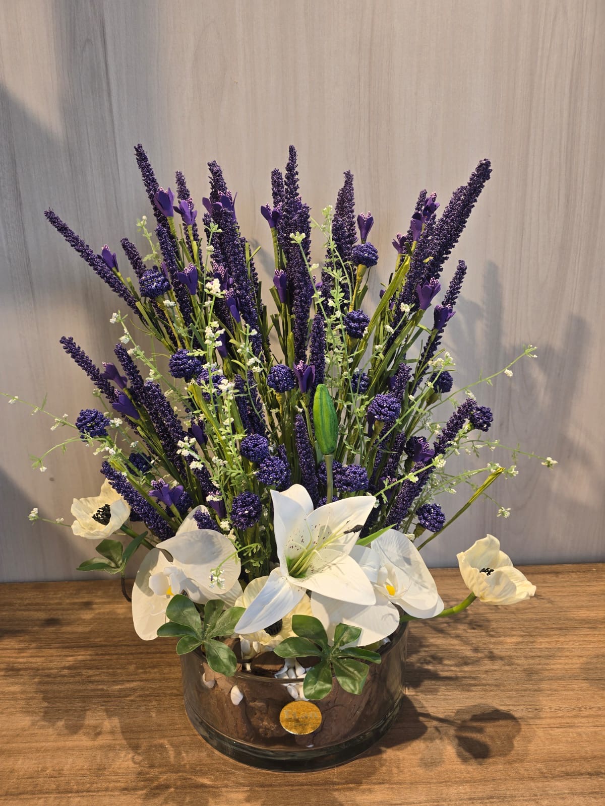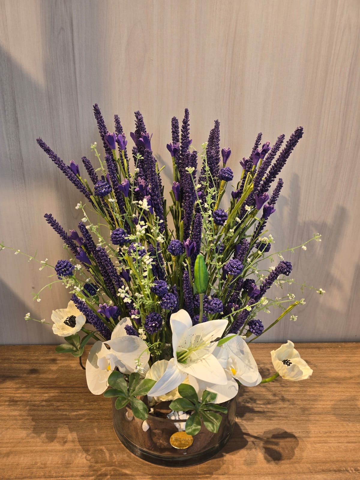 فازة منسقه من اللافندار البنفسجي مع الكذابلانكا البيضاء والاوركيد الابيض