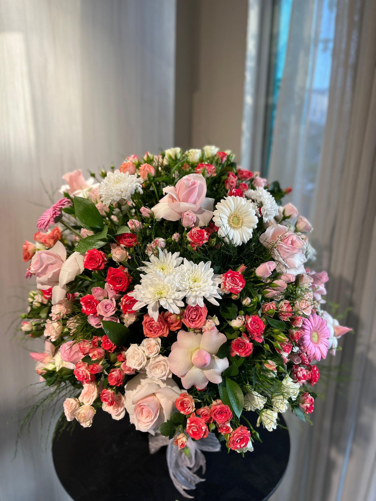 فازة شفاف دائريه منسقه من الجوري البنك والبيبي روزالبنك الفاتح والغامق والابيض مع ورد الجلبيرا البنك والافوايت