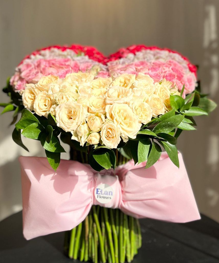 قلب ايلان المكون من البيبي روز البنك والبنفسجي الفاتح والافوايت مع أغصان الرسكوس الخضراء