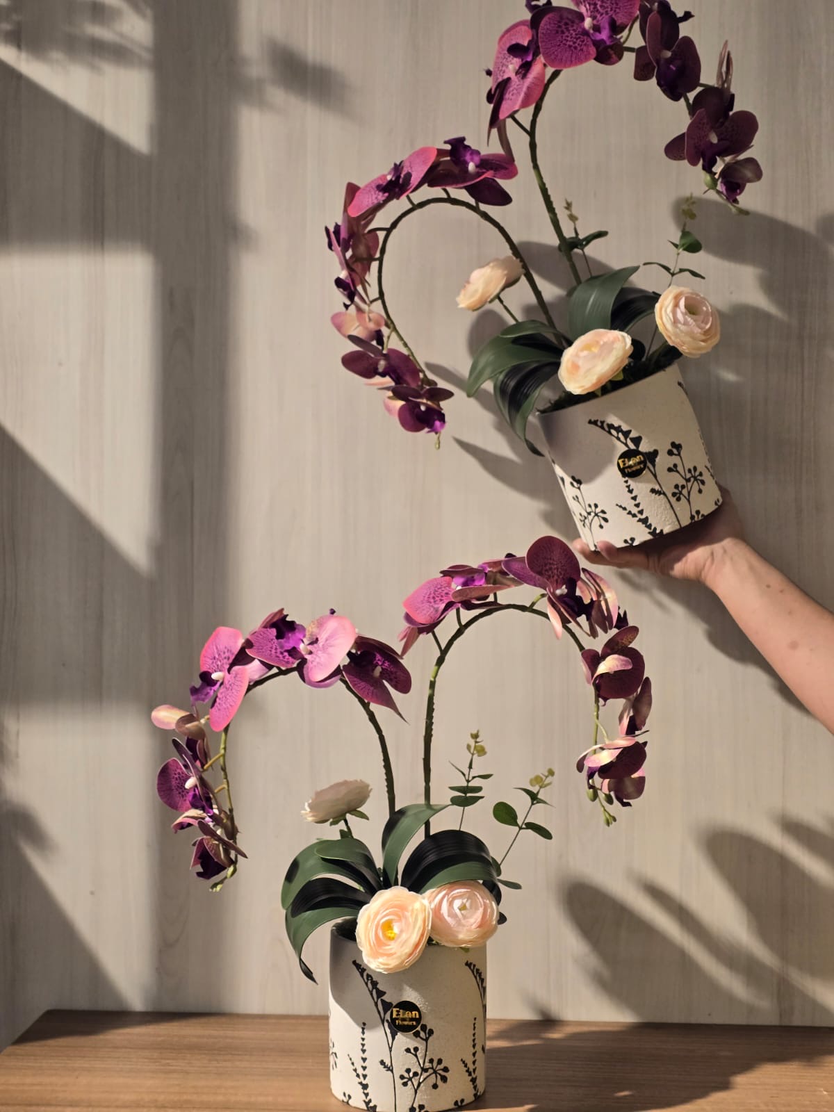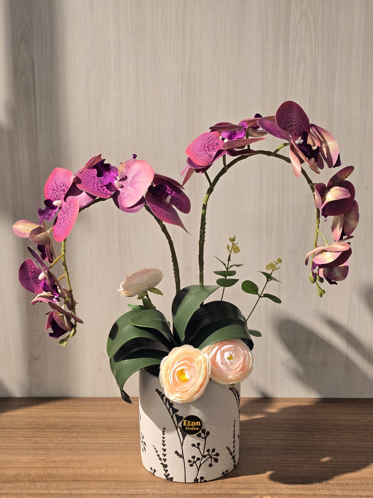 فازة منسقة من ورد الاوركيد العنابي مع ورد الرانكلوس البنك الفاتح
