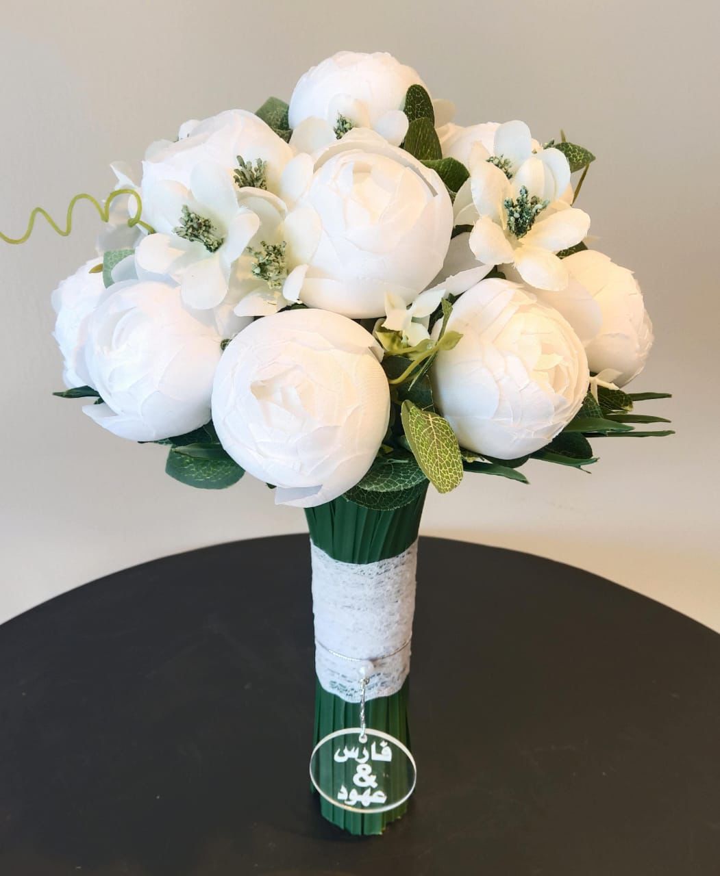 مسكة مكونه من ورد البيوني الصناعي مع أغصان الاستيل قراص الاخضر مغ تعليقه اكليرك الاسماء او الاحرف