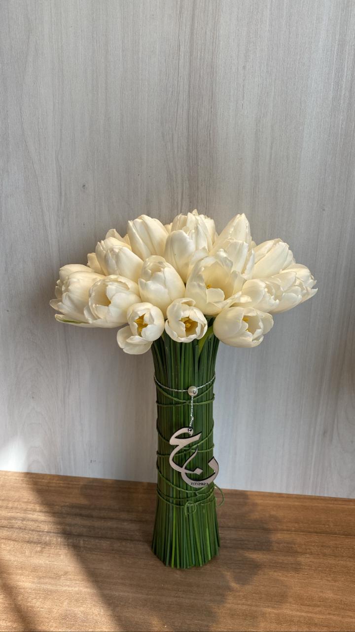 مسكه مكونه من التوليب الابيض الصناعي مع أغصان الاستيل قراص مع تعليقة اكليرك الاسماء أو الاحرف