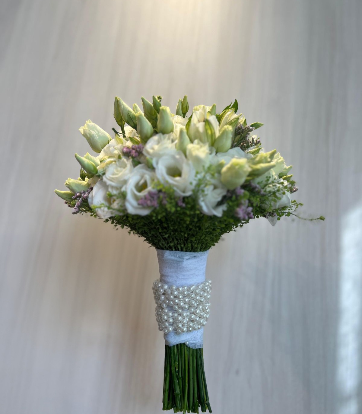مسكه مكونه من الاستوما البيضاء و لمسه من المونيا البنفسجي مع الاغصان الخضراء مع اكسسوار اللولو